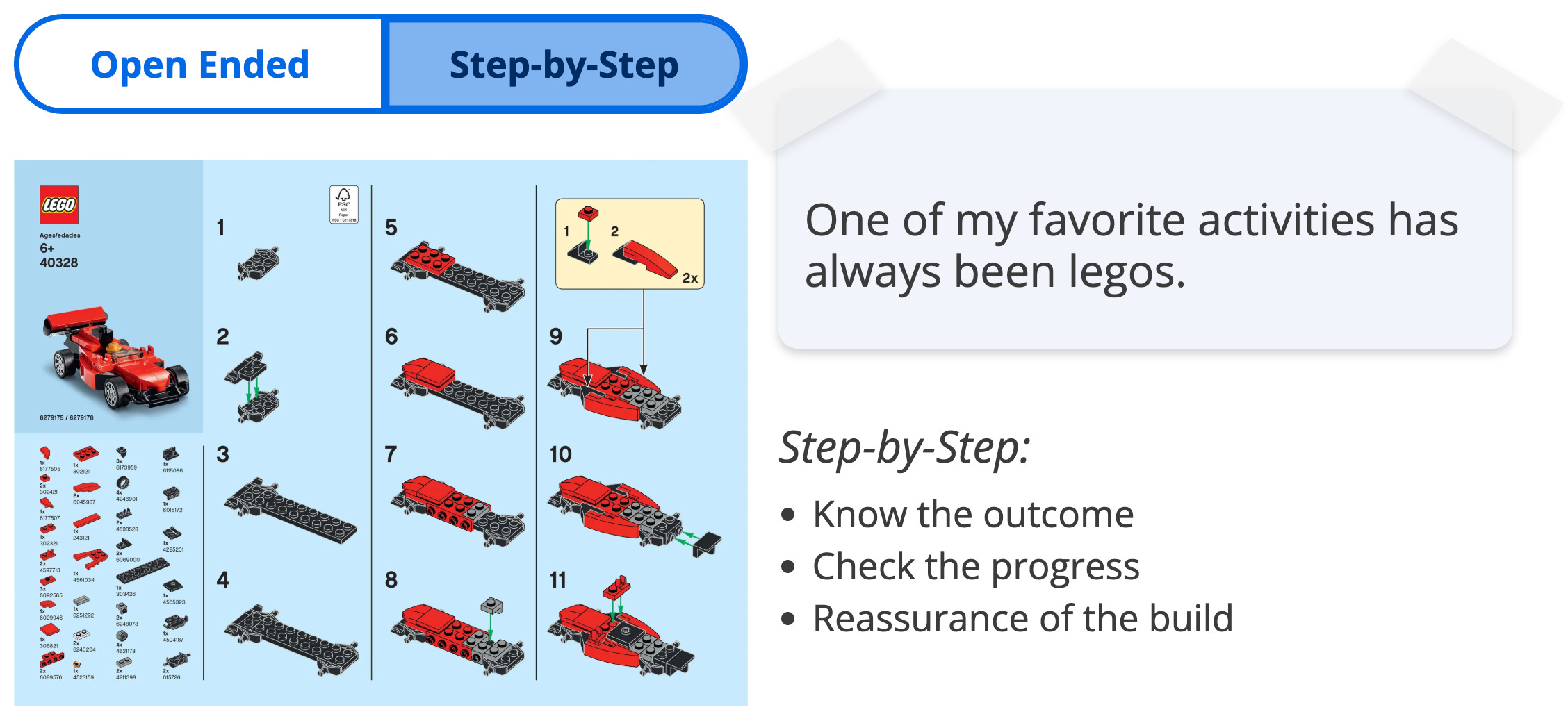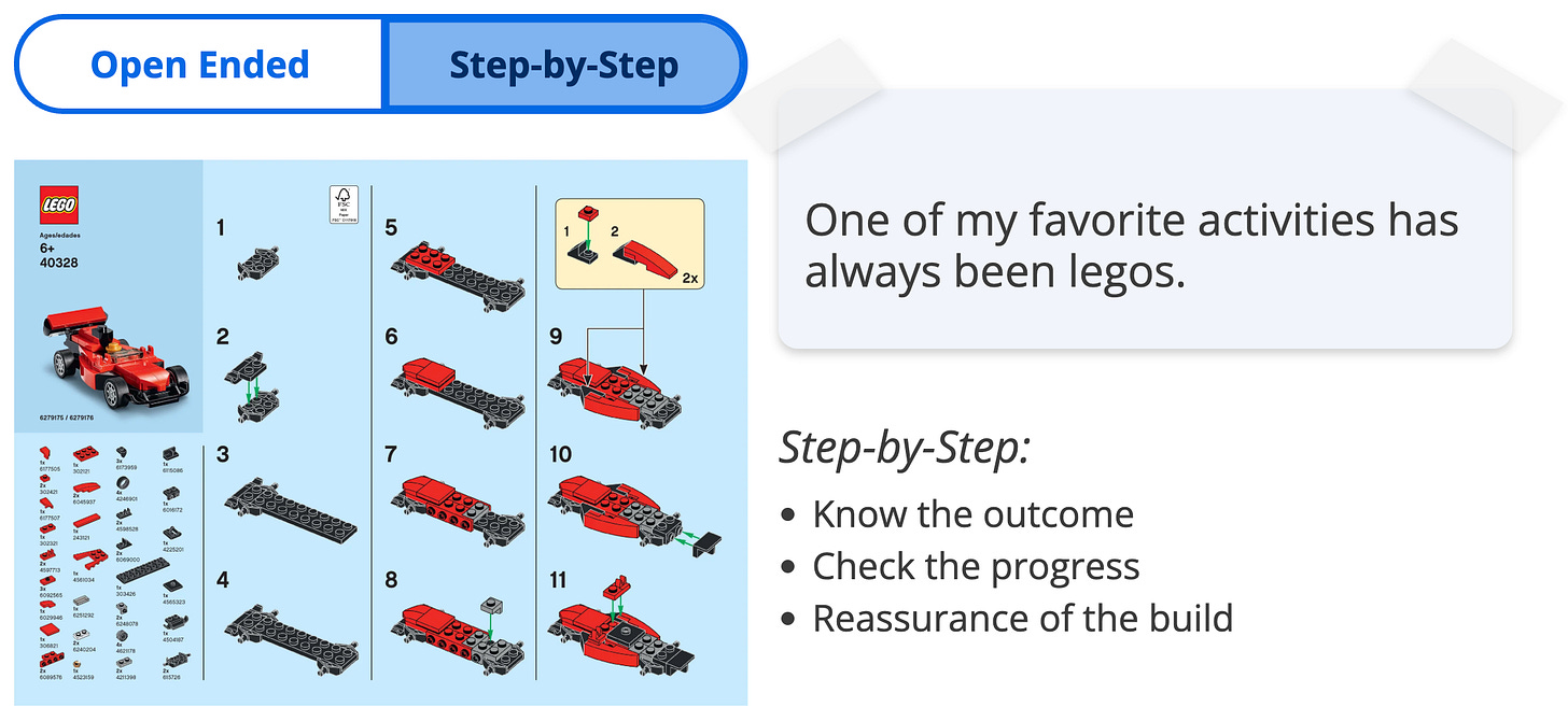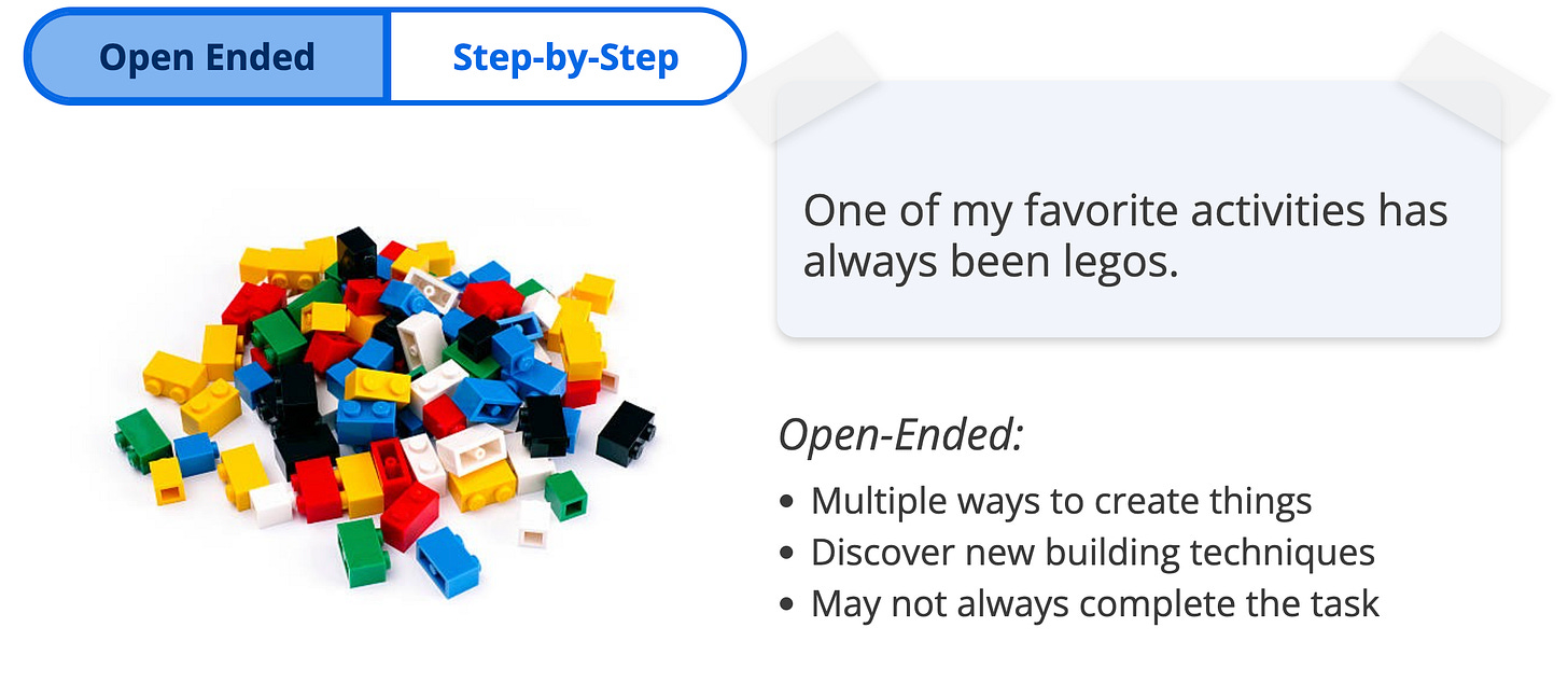 Growing up, we had this giant, chaotic bin of bricks—classic Legos, Duplos, random action figures, a few questionable items like a decapitated Barbie doll head, and even a half-eaten sucker (don’t ask). With that open bin, I’d dive in and start building. Maybe a castle. Maybe a spaceship. Maybe both depending on where my imagination wandered. Sometimes I’d finish what I started, but often I didn’t. Still, every time I played, I learned something: new building techniques, creative workarounds, unexpected structures. It was messy, unpredictable, and pure open-ended cognitive play.